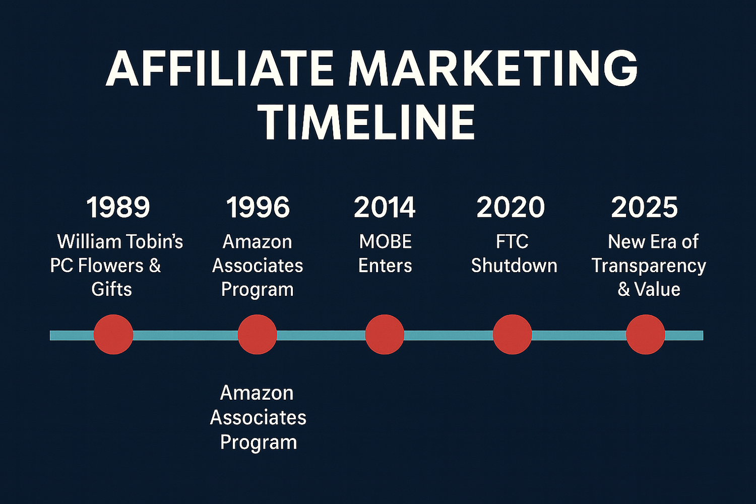 From William Tobin’s 1989 flower shop innovation to Amazon’s global breakthrough in 1996, affiliate marketing has seen both growth and collapse. The 2020 FTC crackdown reshaped the industry and by 2025 it has evolved into a smarter, more ethical model. Explore the timeline below to see how the journey unfolded: